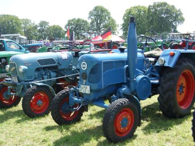 Groß und blaugrün Dieser schön restaurierte Hanomag trieb eine große Dreschmaschine an, sehr passend und eindrucksvoll.