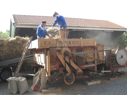 Mit unseren historischen Dreschmaschinen wird das Getreide von den Mitgliedern der Schlepperfreunde gedroschen und das Stroh mit Hilfe einer Oldtimer- Strohpresse (Bj. 1937) zu Ballen gepresst.